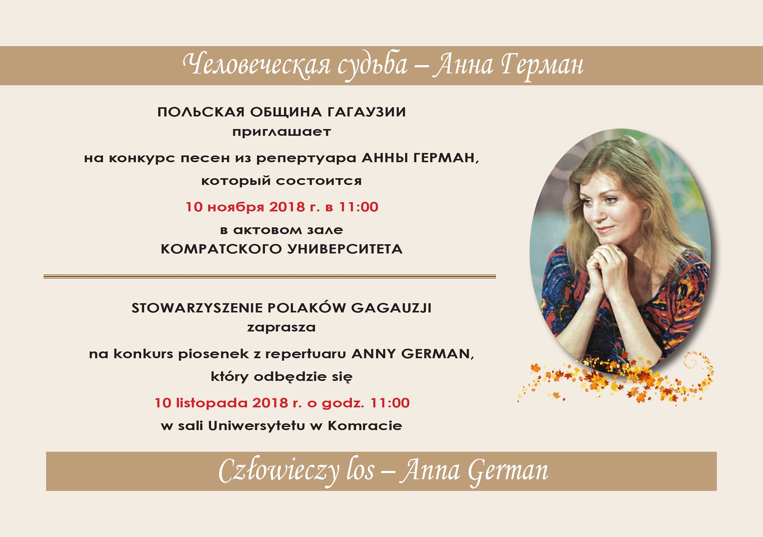 «Польская Община Гагаузии приглашает посетить конкурс на лучшее исполнение песен из репертуара Анны Герман», сообщила председатель польской общины Людмила Волевич.